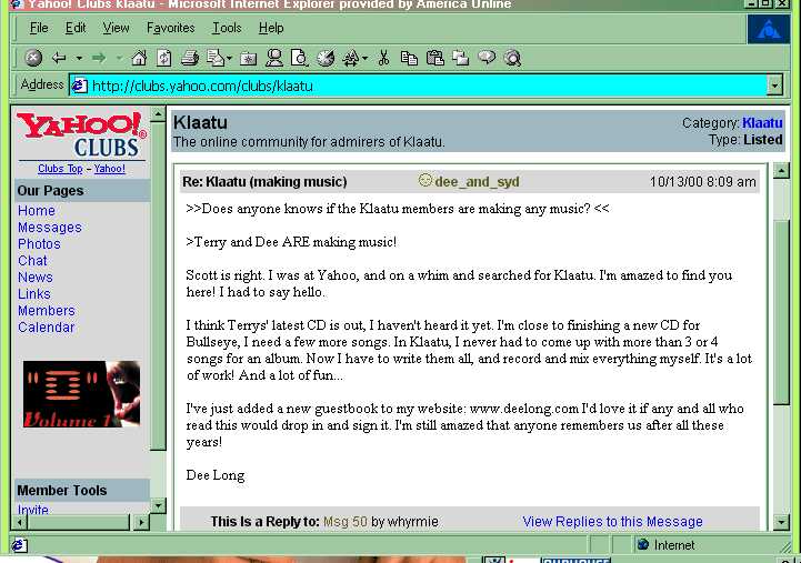 Dee himself replied to one of my postings at the Yahoo "Klaatu" club. See it HERE .
