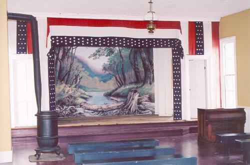 Here is a shot of the theatre/opera house upstairs in the town hall. This is a great old space. The displays described many acts coming into town to entertain and I thought that was an interesting look into the life of small town America in the late 1800's. The scenery you see center stage is a canvas backdrop separating the stage and backstage area. |