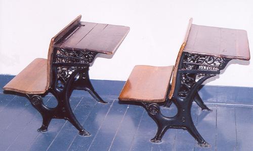 The village school is long gone, but this room displays what items might have been in it. In addition to these desks, the room also has copies of the primers that children learned to read from. |