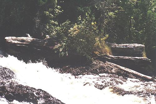 | A shot of a huge, old tree trunk next to the river. It's size and cut end (on the right) to me would suggest that it was lost during logging operations in the era long ago. |
