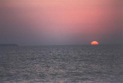 | We'll end this page with sunset over Munising Bay from Aug. 2003. The land mass to the left is Grand Island. |