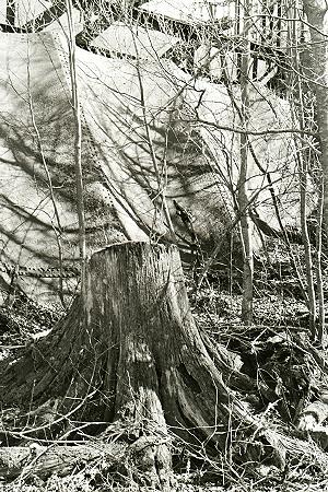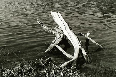 | My first foray into black and white photography. Here is a shot of one of the stumps in the lake behind the timber dam. Photo taken in early May, 2003. |