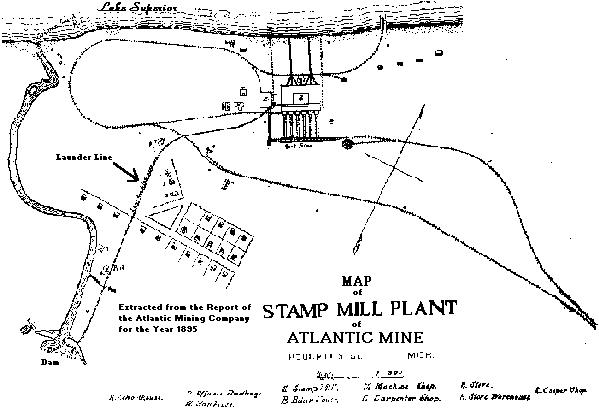 Supplemental pages & images referenced in this chapter:The Atlantic Mining Company had already been in operation for a 23 years before it built it's mill at Redridge. They operated a stamp mill on the shores of Portage Lake near Cole's Creek for years beforehand. Problems arose when the War Department of the federal government told the company that they must either stop dumping the tailings from the stamping process into the Portage, or erect bulkheads to prevent the tailings from filling in the shipping channel. The company estimated that a new mill along Lake Superior would cost up to $100,000 (1), but decided that the increased output they would get out of the new mill, and elimination of the legal hassles associated with the Portage site that the expense would be worth it.