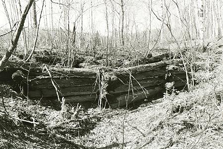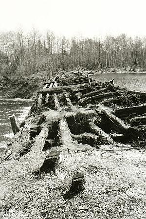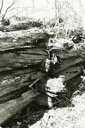 Black and white shot of 'downstream' side of timber dam "offshoot" that is discussed in the main dam section of this website. This portion of the dam does not hold back water, but it is also starting to deteriorate. |