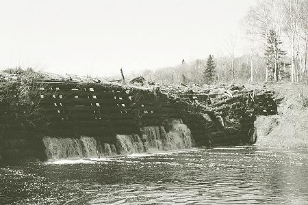 A b&w wide shot of the downstream side of the timber dam, this time taken from the eastern side. The contrast of the b&w photo really brings out the collapsing portion of the dam. |