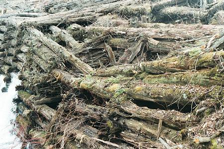 A wide shot of the downstream side of the timber dam. Note the sagging logs on the upper right portion. |