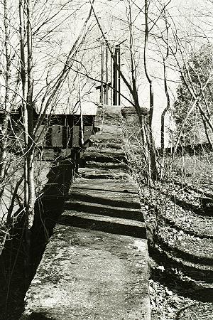 B&w shot of the concrete end wall that marks the transition between the steel dam and the eastern concrete core earthen embankment. The metal sticking up at the top of the wall is a fence that is supposed to block off the railroad trestle to traffic. |
