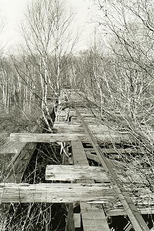 | B&w shot of the railroad tracks on the trestle across the dam site. This trestle does not actually tie into the steel dam structure, it only shares the concrete foundation. I had read somewhere in my research that the rails were removed, but this picture proves otherwise. |