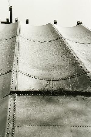 | A b&w isolation shot of the steel plating's upstream side. The pitting is very evident from this angle. You can also see weeds occupying the little "shelf" at the bottom of the plate. |
