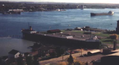 deck of the Tower of History. You can also see an ore boat headed toward the Soo Locks. The