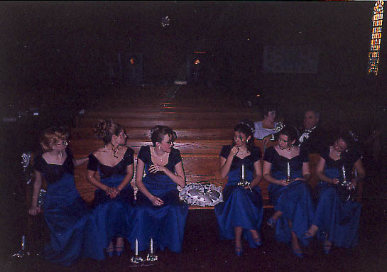The Bridesmaids where: Nicole Buyeau, Kayla Kratochvil, Victoria Villuame, Martha Springle, Katherine Springle, and Michelle Pusey (with mom and dad in the background, as well as a pretty stained glass window).