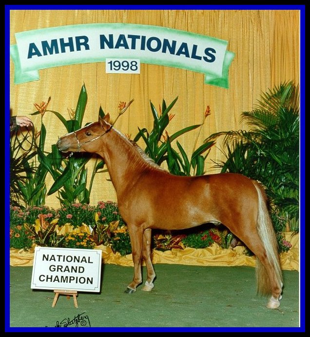 Sired by NFC's Egyptian King Mystique. Fire Alert has an exceptional show record including 1999 National Champion Model Stallion and 2 year old stallion and Reserve Grand National Champion Jr. Stallion. FLASH 1999 Halter Hall Of Fame inductee