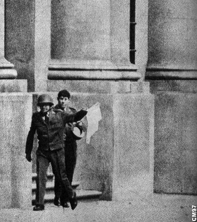 Soldiers during the decisive day in the roof of a building in front of La Moneda, during the beginning of the bombardment.