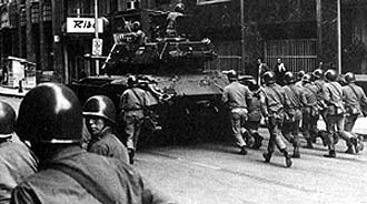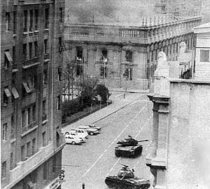 Chilean Army tanks in action in front of La Moneda to demand the disastrous socialist government to give up.