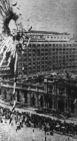 La Moneda being bombed. The great professionalism of the FACH pilots allows them to hit the target without missing and causing damage to other buildings in downtown Santiago.