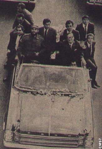 Salvador Allende Gossens y Fidel Castro de Cuba (fue invitado a Chile y se quedo un mes) viajando en el automóvil presidencial, en Santiago de Chile, 1972.