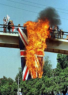 Patriotas Chilenos haciendo patria enfrente de la Cámara de los Lores, a favor del Senador Pinochet.
