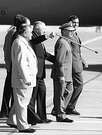 Pinochet in good spirits, walking, after he arrives in Santiago's Arturo Merino Benitez international airport.
