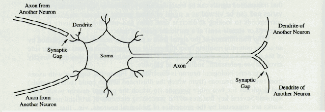 The brain consists of billions of highly interconnected brain cells known as neurons. Individually these neurons are very simple and can accomplish very little. However, when connected together, they form a powerful reasoning system. Each neuron has three basic parts: dendrites, a soma, and an axon. A neuron receives many input signals through its many dendrites. The signals then enter the soma of the neuron and are all summed together. If the summed signal is strong enough, the neuron fires; that is, it sends a signal out through its axon. The many neurons in the brain are connected together, axon to dendrite, to form a network of neurons or a biological neural network. One important thing to remember is that the signal on the axon of a neuron is not going to be exactly the same as a the signal on a dendrite of the neuron it is connected to. The signal is changed, generally strengthened or weakened, by the chemical process that transmits the signal across the synaptic gap.