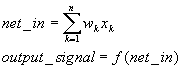 Lets discuss the operation of neural networks. As was stated earlier, each node sums its input signals, pass the summed value through an activation function, and output the resulting value. Generally, input nodes use the identity function, where output is equal to the input, as their activation function. Consequently, the output of a input node is equal to its single input. Because of this property, input nodes and the input layer are often ignored when dealing with neural networks. Each middle node, takes the weighted sum of the output signals from the input nodes and passes it through its activation function. Output nodes repeat the process except they use the output signals from the middle(hidden) nodes as opposed to the signals from the input nodes. The net input and output signal of any particular node (except input nodes) in a neural network can be represented by the following mathematical formula.