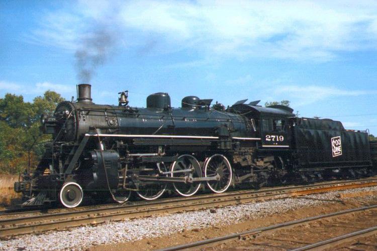 A three-quarter rear shot of the locomotive. Note how the 75-inch drivers dwarf the mechanic who is "oiling around" and completing inspection in preparation for the next days operations.