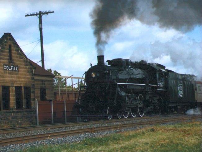 Here's the entire train, posing in Colfax. Click on it to see the picture full-size, which is 1300 pixels wide by 400 high; it's AWESOME! Photo was taken Sunday morning, September 27, 1998. |