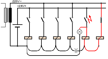 Selten denkt ein Elektroinstallateur bei der Verdrahtung daran, daß sein Massedraht mit 0,5mm2 ein Witz ist, wenn so viele Schützspulen und Geräte darüber ihren Versorgungsstrom ziehen. Und es hilft auch nur wenig, wenn die Verdrahtung mit 0,75mm2 oder gar 1mm2 gemacht wird, speziell dann, wenn Sie mit einem Kurzschluß rechnen - und das müssen Sie wohl. Bei einem Kuurzschluß in der rechten Schützspule wird die "Masse" wohl nahe 110V liegen, bis die Sicherung durchschmilzt, und dann ist alles kaputt, was für 24V ausgelegt ist.