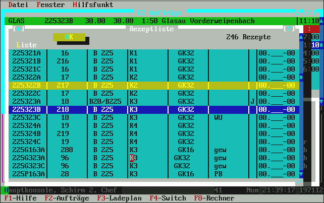 mehr als laut Auftragsbestellmenge noch zur Restlieferung gebraucht wird. Normalerweise genügt hier also einfach die [Enter]-Taste für OK und damit wird die Fuhre im Ladeplan eingetragen. Übrigens: in der oberen Zeile, wo die Uhrzeit-Leiste dargestellt ist, sehen Sie die Belegung der Mischanlage mit lila Kästchen angezeigt. Die Liste zeigt (je nach Fenstergröße) ca. 4-6 LKW aus beliebig vielen. Das ist ein Roll-Fenster. |