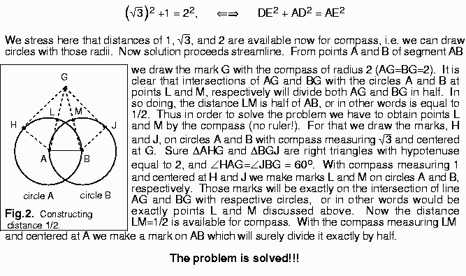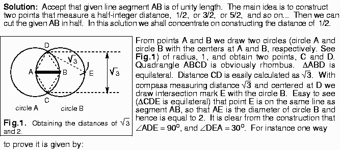"Given a line segment AB, construct the midpoint of AB using only a compass. The compass can be used to draw any circle whose center is a point already drawn and whose radius is the distance between two points already drawn. No straight lines are allowed in this construction except for the line of segment itself"