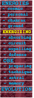 In order to proceed with the personal energizing practice the person must go through three basic exercises: absorption - when receives the energies; circuit - the act of making them flow in and outside the body; expel - when the person exhales the energies in a directed or diffuse flux.