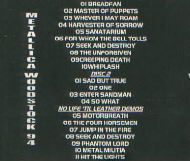 Metallica:Bizzarre A+Faster Metallica, Kill Kill! A-Woodstock '99 AGarage Inc. Tour '98 AWoodstock '94 ALoadin' Barcelona C+Enter Hell ALive From Seattle 1989 ADon't Call Us, We'll Call You A (acoustic FM broadcast)