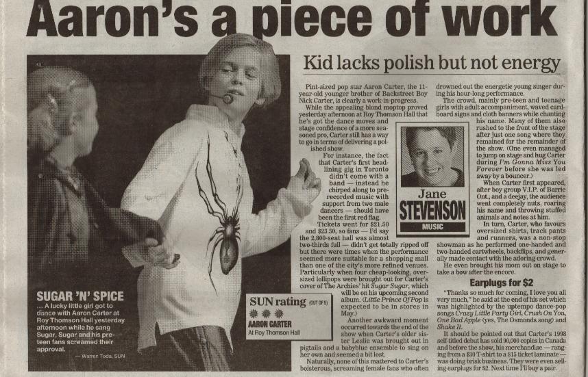 Me and my younger sister Shannon were very excited when it came to Feburary 13. For it was the Aaron Carter concert. It was a birthday gift for my sister from me. When we got to Roy Thomson Hall we saw Aaron Get out of the a van and go into the building. Shannon and I went crazy. Everywhere girls were screaming for Aaron. It was time to in we were 9 rolls back. First a radio D.J. came out and introduced V.I.P. a group opening up for Aaron. Our mom was waiting out in the lounge. She said when V.I.P. was playing she saw Aaron Playing in the snow. We couldn't believe it . He didn't stay out there long. When it was time for Aarom to come on all the girls went crazy. The lights started flashing Aaron's 2 dancers came out in raincoats. Looks like they were looking for Aaron. Then the lights went out and a spot light came on and there was Aaron. Now the screams of fans were so loud my ears started to ring. Aaron did a couple of songs. His dancers came out. Close to the end of the show Aaron's older sister Leslie came out. she was really good. Aaron came out one last time he sang one of his new songs. then he brought out Leslie and their mom Jane Carter out. He said "Thanks so much for comming, I love you all very much". We love him. It was a great concert. We can't wait until Aaron comes back. |