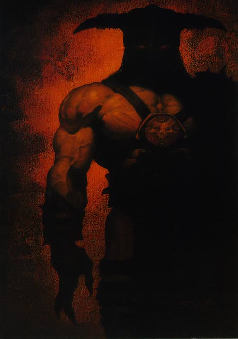 The gigantic manlike shape began to emerge from the rift, first the massive arms then the head of the great demon peered through but no facial features were apparent as his horned visage was cast in shadows, only his smouldering bright green eyes shone through the blackness along with the long gleaming white fangs that dripped a caustic venomous liquid that when it touched the ornate stone floor seemed to melt away the places it landed. His glimmering deep blood red body was well muscled and draped in bright crimson and violet cloths and a huge pair of folded wings trailed behind this incarnet of purest evil.