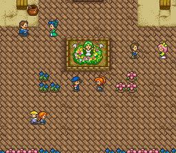 1st Day of Spring: The First Day. Climb to the mountain top to see the beautiful sunrise of the first year. Some people show up, but most likely not your lover, unless it's Eve. I think another girl shows up.. anyway, talk to the midwife for your lucky card, and watch the sunrise... it's SO pretty. Too bad there's no dancing. :( 23rd Day of Spring: Flower Festival. Everyone loves flowers! The town is covered in plants as you enter the Flower Festival. You can buy a Snowseed, which you can plant on the mountain top in Winter for a Power Berry. You can buy perfume (check the girls section to see who likes which perfume), but it's 1,000 GP each! O_O Anyway, this festival does include a dance, so grab your partner and doe-see-doe! 12th Day of Fall: Harvest Festival. My personal favorite. ^^ Everyone but Maria gives you food! And Maria praises you! Anyway, this is the national eating day, where you stuff yourself silly. Also, bring a food for the stew. I advise you bring the Moon Flower from the mountain's peak (from Fall 10th to 12th) to get a Power Berry, but anything's fine. You can even throw in a mole. >:) Anyway, this festival does have a dance. 20th Day of Fall: Egg Festival. This is the major excersize festival that involves a LOT of running. You must run around like a frenzied idiot, looking around town in chests for the egg that the major has. For example, if he holds up a blue egg, run around town and find the blue egg. If you win, you'll get either a charm to prevent disasters or a Power Berry. If you get one, you'll get the other next year. The Livestock Dealer will win if you don't. Since you're tired enough already, there's no dance. I love festivals!! Especially the Flower Festival. Nina likes the Flower Festival. And flowers. Flowers and good. And plants, but let's not get into that. Just flowers. But flowers are plants. Do you like the Flower Festival? 10th Day of Winter: Thanskgiving Day. The male's day off while the girls cook cakes for the ones they love. If your honey gives you a cake, you know you're doing fine. Try to get all 5 girls to give you a cake! But.. no dance. :( 24th Day of Winter: Starlight Night. Final festival of the year, you can go to 5 places; The spa, the public square, the mountain top, the bar, or the church. Nina's at the mountain top, Ann is at the spa, Ellen is at the public square, Maria is at the church, and Eve is at the bar. Back to the Harvest Moon section! Back to my main page! © 1997 starpeppy@hotmail.com This page hosted by Get your own Free Home Page