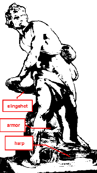 Bernini's statue is faithful in most aspects to the biblical story: David is swinging the slingshot toward Goliath, while the armor he chose not to wear - lays at his feet. Because, Goliath is at some distance from David at this point in time, his figure is not included in the statue. It appears that Bernini saw importance in being familiar with the biblical scenes one is depicting in art, as is evident from his remark regarding the painting of the Crucifixion by Sarrazin [2].