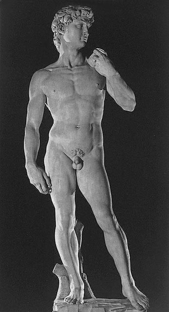 Michelangelo’s David is truly the idealization of a young hero at the peak of his virility. The sculptor personifies his idea of perfection through this stunning display of male anatomy. Every aspect of the David is ideal, from his commanding brow bone and nose bridge to his slender, yet well-defined pectorals and abdomen, and even to his completely and unabashedly exposed genitals. The hero’s head is turned to the left, presumably in the act of sizing up the task at hand. While many artists use their subject’s direct gaze at the audience to convey power and stature, Michelangelo chooses to convey David’s heroic bravery through his perfect, nude body. Michelangelo, characteristically of the Renaissance, saw the interior character of man reflected in his exterior body and, thus, expresses the moral state of this well-known figure’s soul through his depiction of David’s body and form. He interprets David’s character to be heroic, admirable, and ideal; therefore, his immortalized incarnation of David is not of a skinny shepherd boy, but of a potent and bold nude man—his personification of a perfect soul.